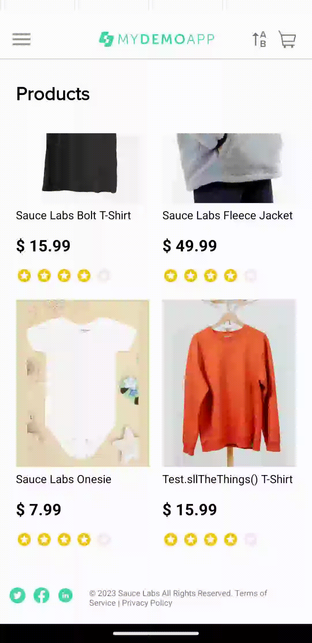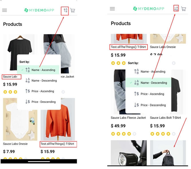 "Sauce Labs ________". 1. Functional bug или неправильная иконка: при выполнении в каталоге сортировки товаров "Name - Ascending" (по возрастанию, т.е. от последней буквы алфавита к первой букве) по факту производится противоположная сортировка названий товаров от первой буквы к последней. Итого, после выполнения сортировки первым товаром идет "Sauce Labs Backpack", а последним - "Test.sllTheThings() T-Shirt", хотя в английском алфавите буква "T" идет позже "S". Т.е. при заявленной сортировке по возрастанию, первым товаром должен быть указан "Test.sllTheThings() T-Shirt". Также в обратном порядке заявленному отсортированы между собой товары, которые начинаются с "Sauce Labs ________". 2. Functional bug или неправильная иконка: при выполнении в каталоге сортировки товаров "Name - Descending" (по убыванию, т.е. от первой буквы алфавита к последней букве) по факту производится противоположная сортировка названий товаров от последней буквы к первой. Итого, после выполнения сортировки первым товаром идет "Test.sllTheThings() T-Shirt", а последним - "Sauce Labs Backpack", хотя в английском алфавите буква "S" идет раньше "T". Т.е. при заявленной сортировке по возрастанию, первым товаром должен быть указан "Sauce Labs Backpack", а последним - "Test.sllTheThings() T-Shirt". Также в обратном порядке заявленному отсортированы между собой товар, которые начинаются с "Sauce Labs ________". |