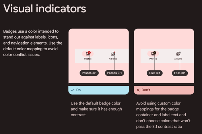 Предложение к улучшению: Изменить цвет счетчика (badge) иконки корзины на Top app bar, показывающего кол-во товаров, добавленных в корзину на цвета, согласно рекомендациям Material Design 3 (Components > Badges): Specs https://m3.material.io/components/badges/specs#8d8fdd35-be65-4e9c-9de2-e95e73d756da - для светлой темы - #B3261E (оттенок красного), - для темной темы - #F2B8B5. Material Design 3 (Components > Badges): - Guidelines: "Badges use a colour intended to stand out against labels, icons, and navigation elements. Use the default colour mapping to avoid colour conflict issues." (https://m3.material.io/components/badges/guidelines#c5072b7d-7024-4ef7-b817-d756c8825565) - Accessibility: "Avoid using custom colour mappings for the badge container and label text and don't choose colours that won't pass the 3:1 contrast ratio" (https://m3.material.io/components/badges/accessibility#809c5abe-988c-4a70-8819-07db451587f8) |