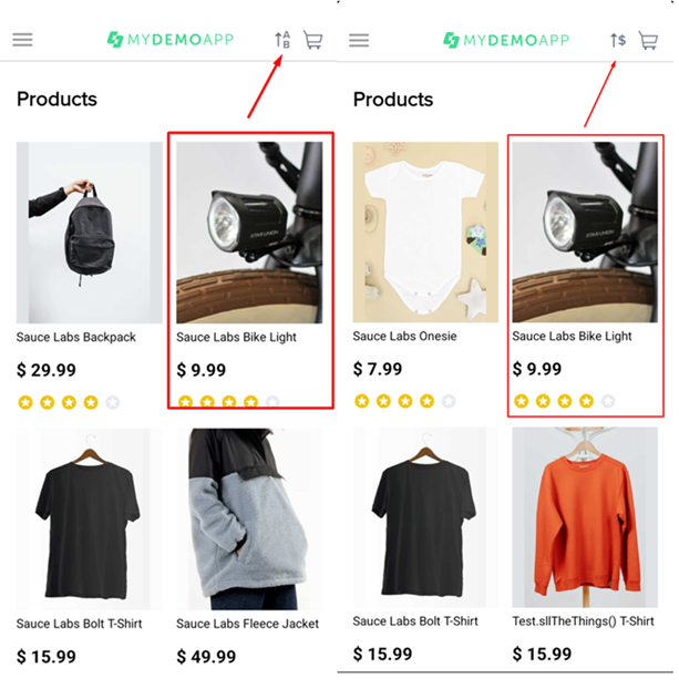 Functional bug: При установленных видах сортировки товаров: 1) по алфавиту в порядке от A до Z (дефолтная сортировка); 2) по увеличению цены, - карточка товара "Sauce Labs Bike Light" не открывается, а приложение прерывает работу и сворачивается. Есть несколько вариантов прерывания работы приложения при открытии карточки в указанных случаях: а) Частые результаты: - Приложение сворачивается без сообщения о сбое. Приложение можно увидеть в процессах девайса, нажав на кнопку Overview, и восстановить работу до экрана Products; - Приложение сворачивается c сообщением от системы "My demo App keeps stopping". Приложение можно увидеть в процессах девайса, нажав на кнопку Overview, и восстановить работу до экрана Products. б) Редкие результаты: - Перенаправление пользователя на другой экран приложения (например, Drawing). Повторяемость: Иногда, а именно только при указанных видах сортировки (в них повторяемость - всегда, но с разными вариантами прерывания работы приложения). Работа приложения корректна (карточка товара открывается) при следующих видах сортировки: 1) по алфавиту в порядке от Z до A; 2) по уменьшению цены. |