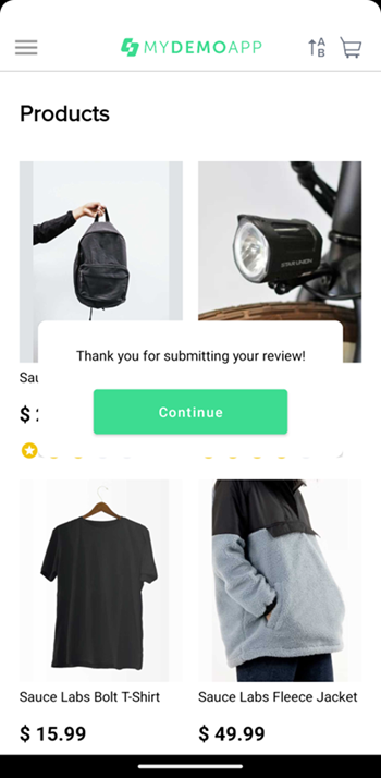 (log in) в приложении: 2.1. Тапнуть на каждую из пяти кнопок иконок-звезд в шкале товара. Ожидаемый результат: появление диалогового окна "Thank you for submitting your review!" с кнопкой "Continue". 2.2. Закрыть диалоговое окно "Thank you for submitting your review!" с помощью Back button девайса. 2.3. Тапнуть на кнопку "Continue" в диалоговом окне. Ожидаемый результат: диалоговое окно закрывается, а результат изменения рейтинга отображается на шкале. Например, если пользователь тапнул на третью звезду (порядок считается обычно - слева направо), то рейтинг становится 3 звезды из 5. Если на первую, то рейтинг становится 1 звезда и т.д. |