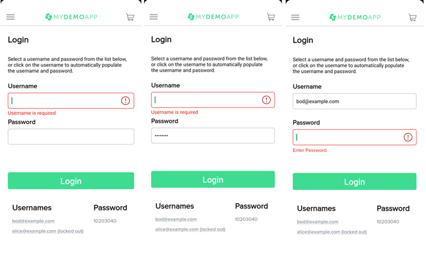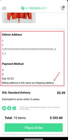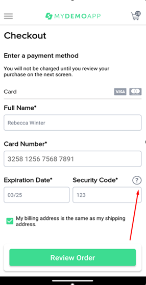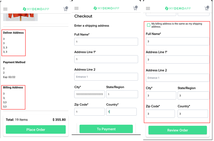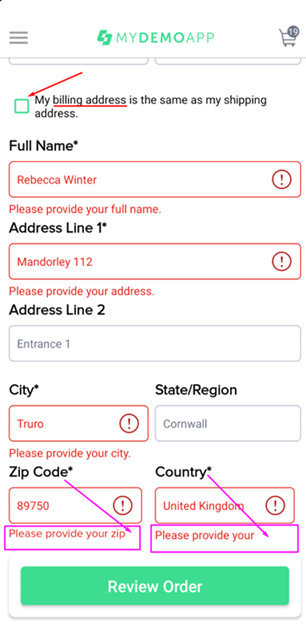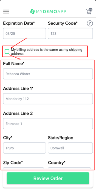 Убрать галочку в чек-боксе. Ожидаемый результат: на экране появиться дополнительная форма ввода Billing Address. 2. Тапнуть на кнопку "Review Order", когда поля формы Card заполнены, а поля формы Billing Address пустые. Ожидаемый результат: приложение не совершит переход к следующему этапу, появятся сообщения у каждого обязательного к заполнению поля о необходимости его заполнить. |
