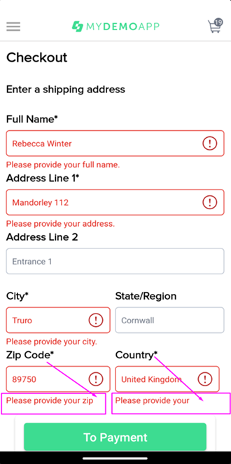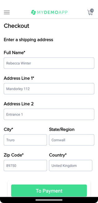 Заполнить поля, обязательные к заполнению (отмечены *). 2. Оставить поля, не отмеченные * пустыми: Address Line 2, State/Region. 3. Тапнуть на кнопку To Payment. |
