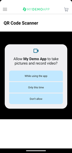 | SCR-QR1 | QR Code Scanner | Через Меню | Permissions | TBD | TBD | TBD Предварительный результат: После первого отказа в предоставлении разрешения и повторном переходе в раздел "QR Code Scanner" приложение не запрашивает разрешение повторно и возвращает пользователя в раздел Products. Т.е. пользователь после отказа уже не может зайти в этот раздел и изменить свое решение о предоставлении разрешения. Тот же результат - после закрытия приложения. |